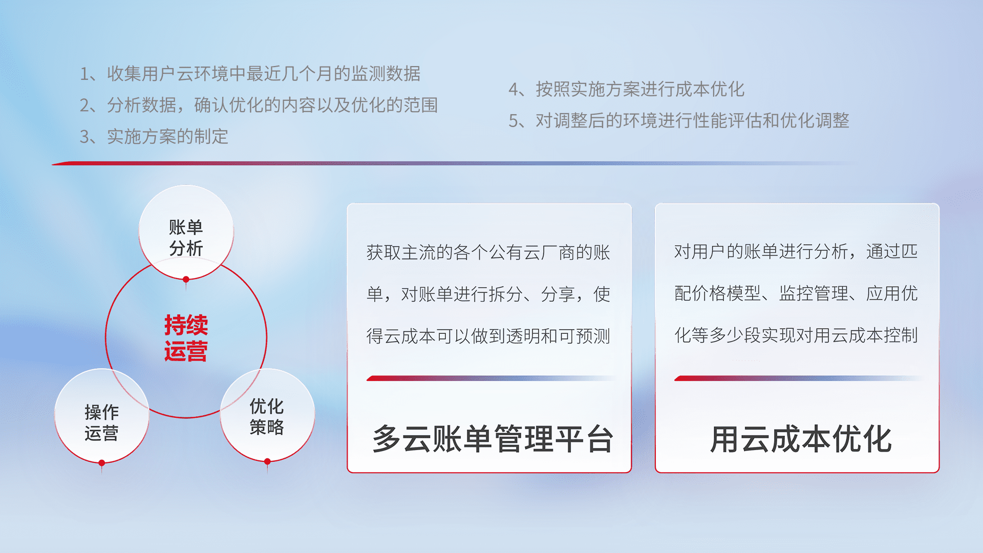 通过多云纳管,,以统一的资源数据模型把客户的云资源进行抽象和封装,,,进而实现对多云资源的统一操作,,,,保障云资源管理的可靠性、、稳定性与可用性。。量身定制化运维内容,,,配置、、、、开发运维、、、补丁管理、、、、备份、、监控、、、认证和访问管理、、、审计和日常巡检等,,保障在用云过程中的可靠度,,,,稳定度以及高可用率。。。