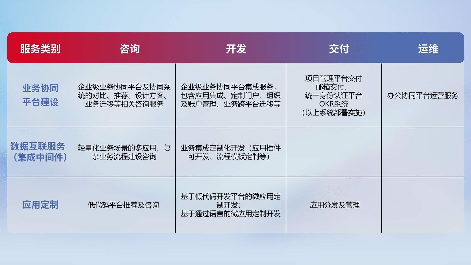 针对钉钉、、、、企微、、、、IDaas等平台级产品提供产品的规划、、、、方案、、、交付、、定制化开发等服务,,,,实现如统一协同办公、、智能客户服务、、混合会议管理、、、、智能数据查询、、、、等业务场景,,实现数字化转型。。
